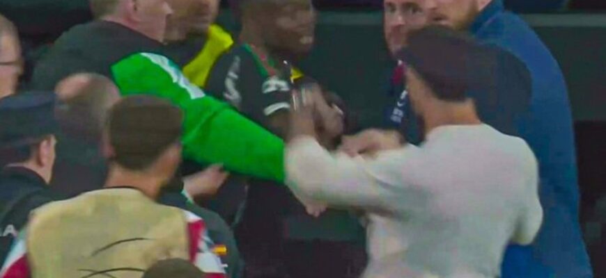 В перерыве напряженного матча между Реалом Мадрид и Арсеналом Букайо Сака и Дани Карвахаль были разведены в стороны из-за возникшей потасовки.