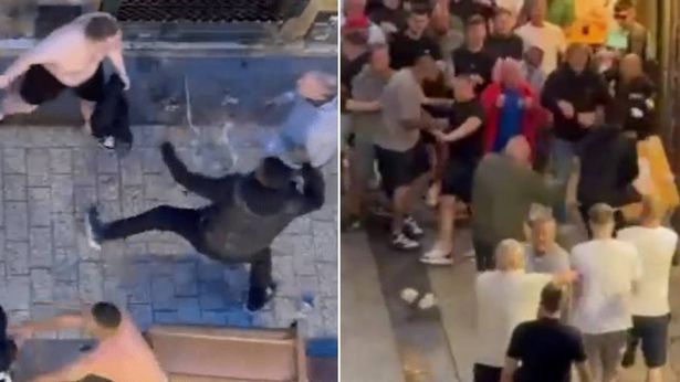 На шокирующем видео видно, как большая группа футбольных хулиганов устраивает потасовку, бросая друг в друга предметы и нанося удары.