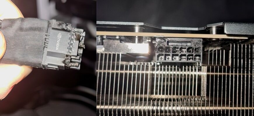 Проблемы с кабелями питания и разъемами отмечались еще в серии RTX 4000, и, к сожалению, эти недостатки сохранились и в новой серии RTX 5000. В интернете пользователи делятся фотографиями расплавленных разъемов, сгоревших проводов и даже непосредственно флагманские видеокарты, возникших при нагрузке.