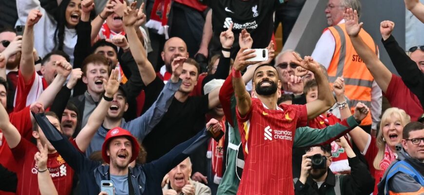 Игроки и болельщики вместе праздновали успех после матча, при этом Мо Салах делал селфи на фоне трибуны Коп.