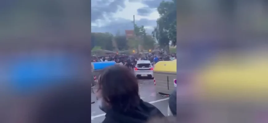 Видно, как молодежь, предположительно болеющая за ПСЖ, вступает в противостояние с полицией по борьбе с массовыми беспорядками.